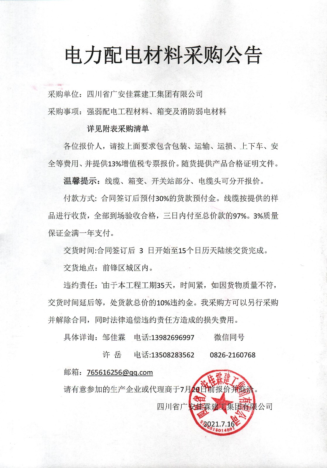 電力配電材料采購公告